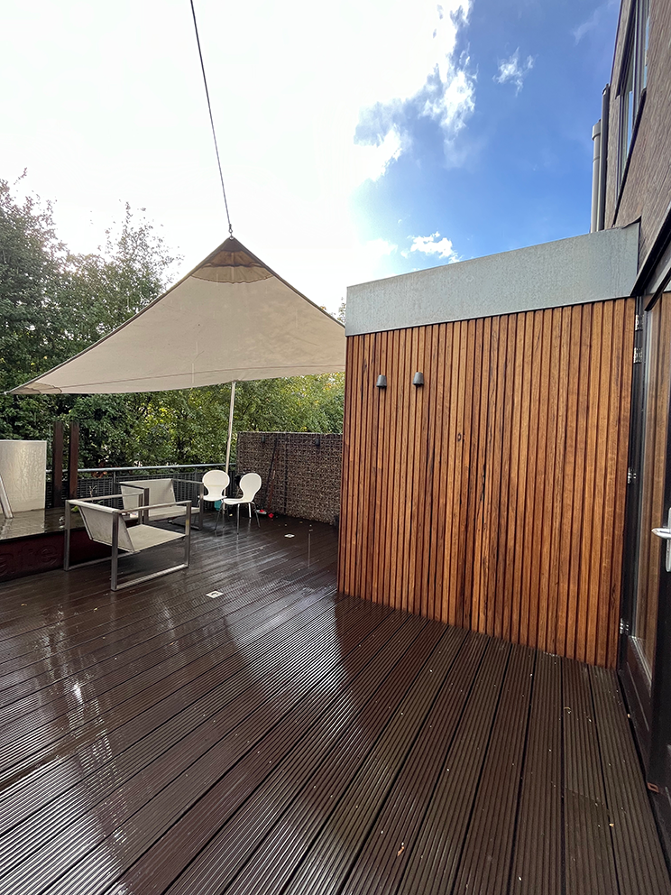 De gevel van deze aanbouw is uitgevoerd met blind bevestigde verticale Fraké triple Rhombusdelen. De boeiboorden zijn uitgevoerd in zink en hebben een dubbele functie als deklijst.
