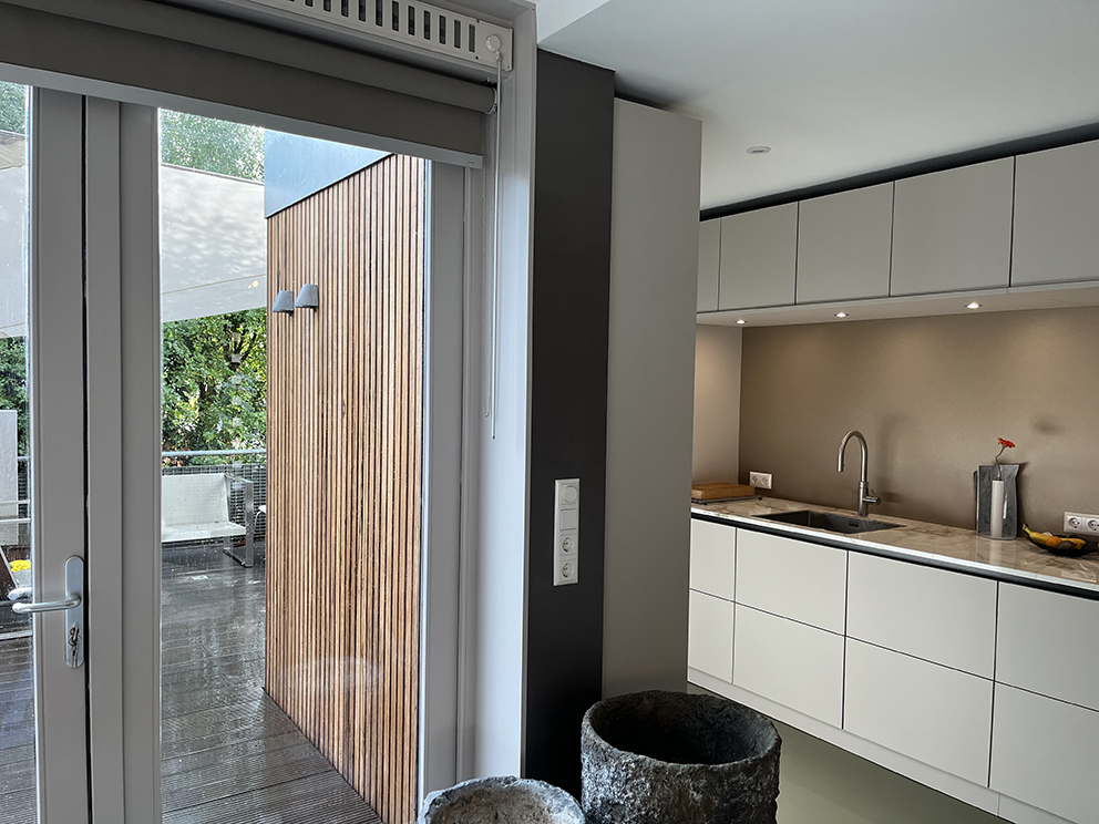 Deze zinken deklijst heeft naast de esthetische functie ook een praktische functie, namelijk het zonweringsysteem. Dit systeem is geïntegreerd in het dak.