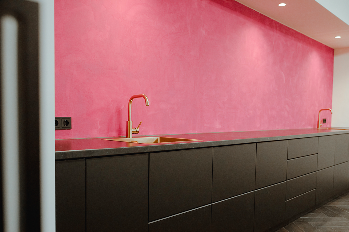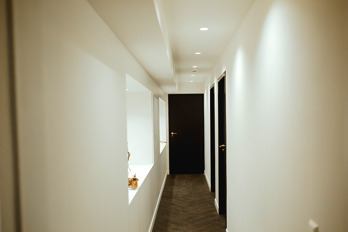 De stalen deuren en visgraat vloer maken deze ruimtes helemaal af.